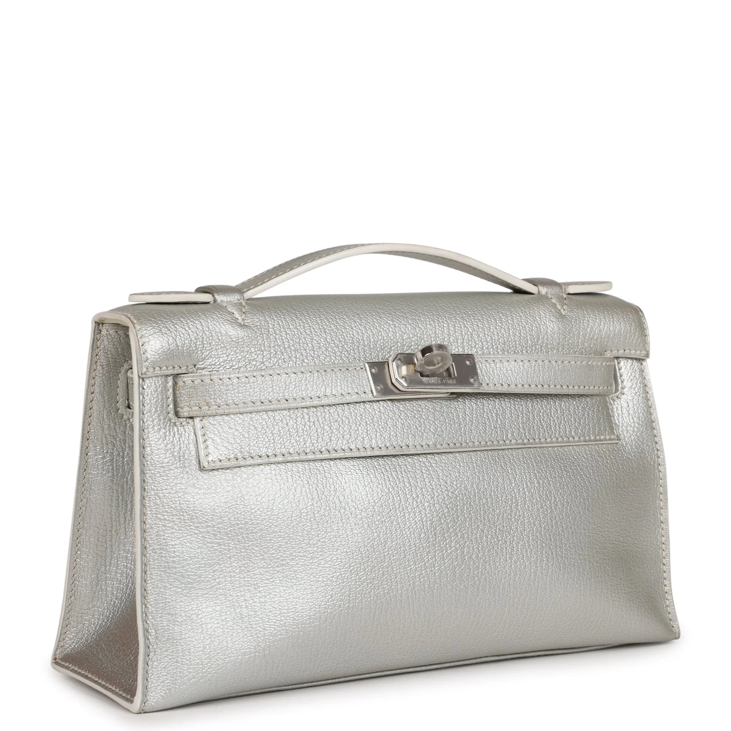 Vintage Hermès Kelly Pochette Silver Metallic Chevre Palladium Hardware
