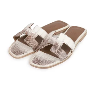 This pair of Oran Sandals are in Himalaya niloticus crocodile with tonal stitching and feature the iconic H crossover strap.